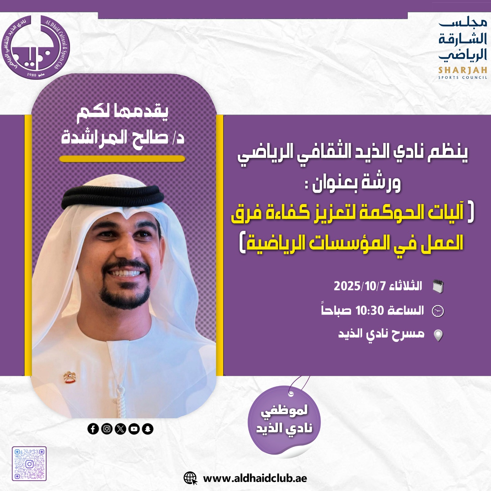 يدعوكم نادي الذيد الثقافي الرياضي للمشاركة في الفرصة التطوعية " تنظيم ورشة آليات الحوكمة لتعزيز كفاءة فريق العمل " وذلك من خلال المساهمة في الأعمال التنظيمية و الإشرافية خلال الورشة .