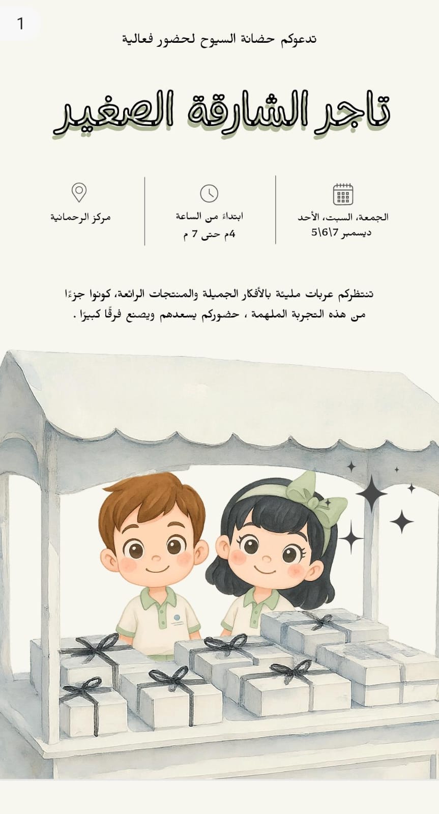 تدعوكم حضانة السيوح للمشاركة في الفرصة التطوعية الميدانية " فعالية تاجر الشارقة الصغير " وذلك من خلال المساهمة في تقديم الدعم التنظيمي والإشرافي على الفعاليات المختلفة لأطفال الحضانة .